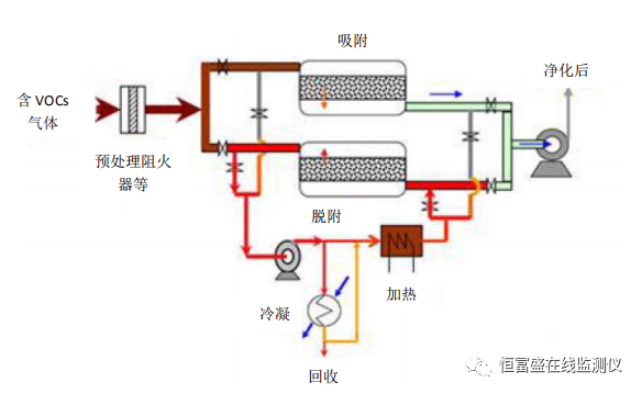 采用活性炭作為吸附劑,采用惰性氣體循環加熱脫附分流冷凝回收的工藝對有機氣體進行凈化和回收。回收液通過后續的精制工藝可實現有機物的循環利用。工藝原理示意圖如下: