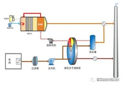 工藝流程主要由沸石轉輪濃縮(吸附區域、脫附區域、冷卻區域)、脫附系統、蓄熱式燃燒系統(RTO爐體、陶瓷蓄熱體、燃燒系統等)及控制系統等部分組成。